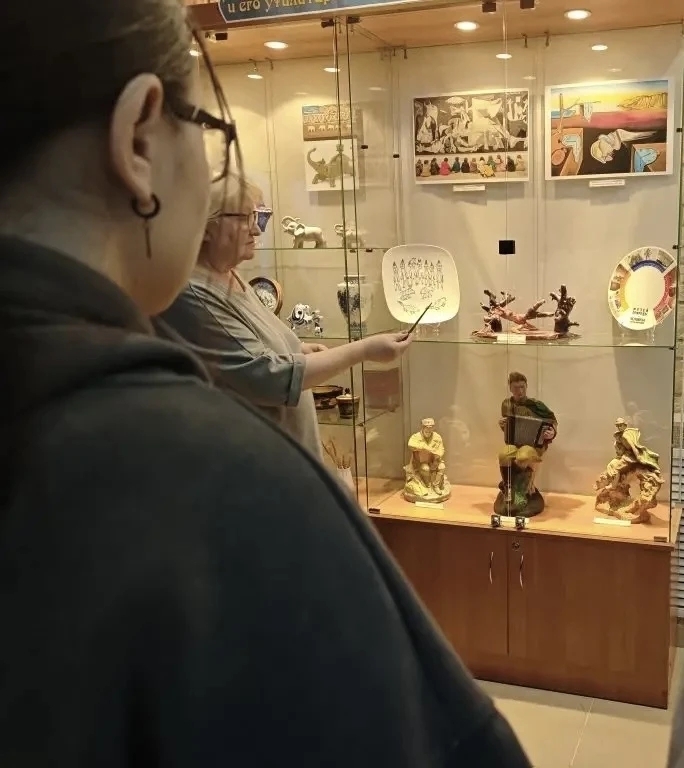 Эту выставку посетили учащиеся 8 класса Березовской СОШ. Ребятам была предложена к ознакомлению работа резчика по дереву Михаила Шихова - трансформация символической композиции «три обезьяны» (не вижу, не слышу, не скажу) получившая широкую популярность в настоящее время. Так же ребятам рассказали о традиционных русских промыслах «Гжель» и «Хохломская роспись», и предметах, выполненных в этих техниках, перешедших из бытовых в сувенирную продукцию.